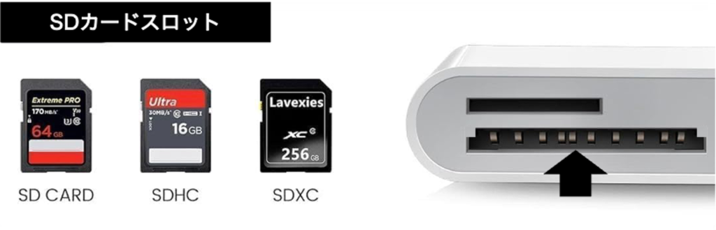 SDカードを矢印のスロットに奥までしっかりと挿入して下さい。Windows PC、Mac、iPhone、iPad、androidスマホ、androidタブレットのUSB-C端子に本製品のUSB-C端子を接続して下さい。ドライバや専用ソフトウェアは不要です。自動的に認識されます。(PLUG & PLAY)
