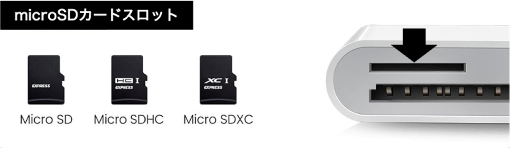microSDカードを矢印のスロットに奥までしっかりと挿入して下さい。Windows PC、Mac、iPhone、iPad、androidスマホ、androidタブレットのUSB-C端子に本製品のUSB-C端子を接続して下さい。ドライバや専用ソフトウェアは不要です。自動的に認識されます。(PLUG & PLAY)